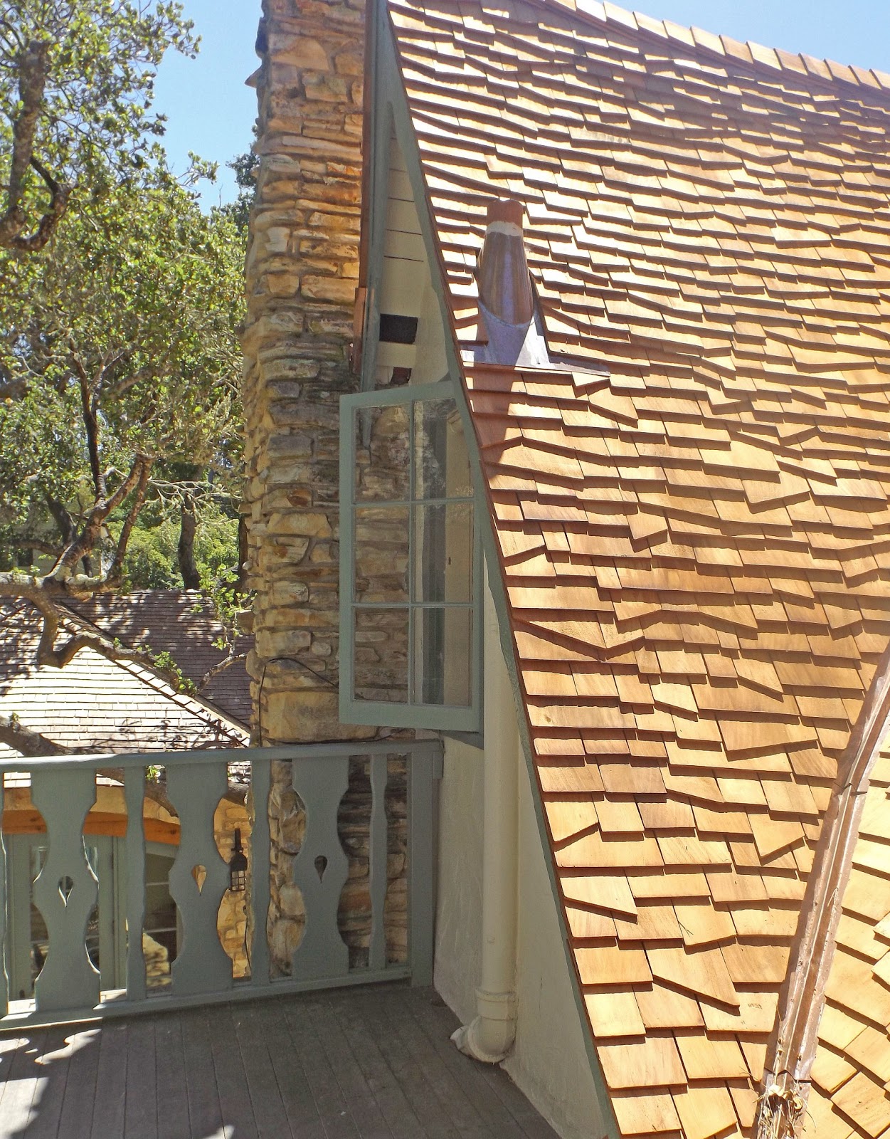 and balcony with Comstock's now signature pierced flatwork railing was also added in 1940. From this balcony the intricate and time consuming details of the new roof by Alcal Specialty Contracting, Inc. can be seen close up.