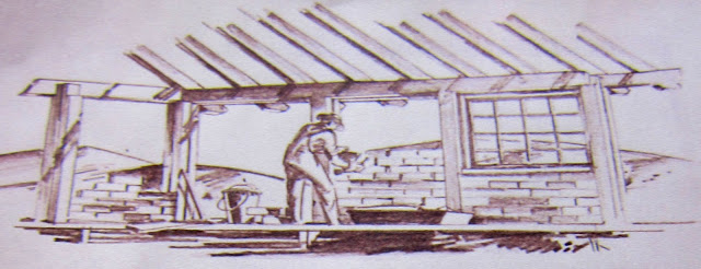 Hugh Comstock's Post-Adobe combined the "best features of both a sturdy timber frame and modern waterproofed adobe walls. Heavy eight-inch posts of redwood or cedar are placed at all window openings, door openings, and corners of the house...Waterproofed adobe masonry, of the same thickness as the posts, is placed in the wall spaces between the posts as a filler material (as shown in the illustration below from Post-Adobe by Hugh Comstock)." (2)