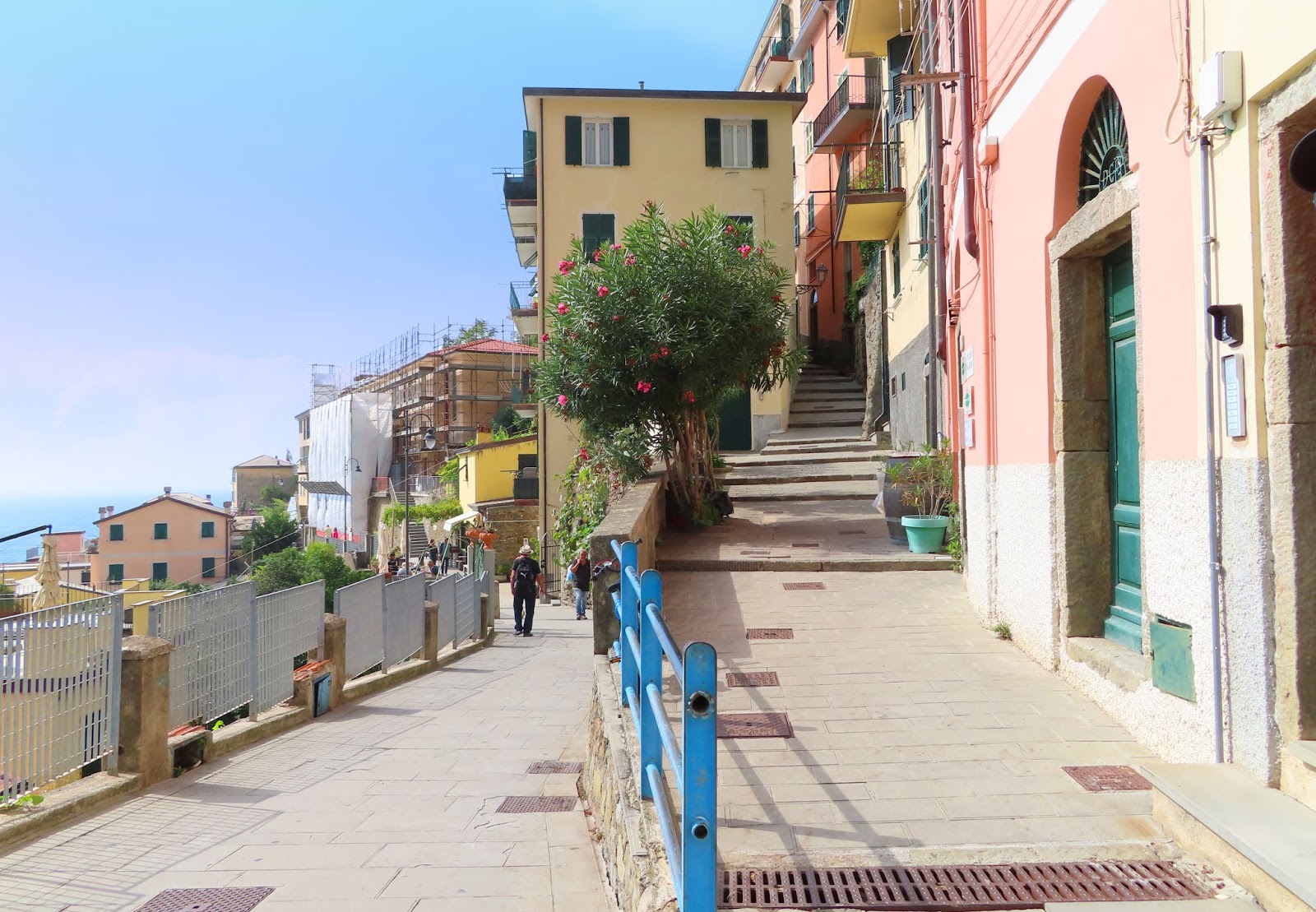 Again turn around and with your back to the front door of the church this time you will walk straight ahead and take the left side of the street (the one without the stairs). The blue railing will be on your right as you walk. This will be the via Telemaco Signorini. Continue on this down the hill, walk past the pedestrian tunnel to over look to the sea.